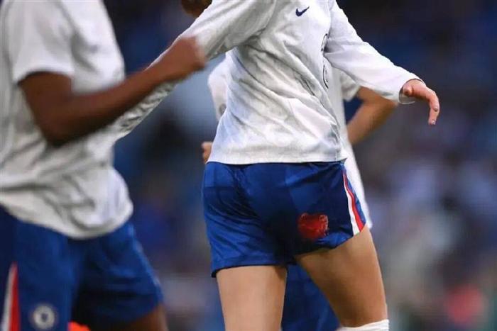 近日,英超女足联赛出现了这样一幕:正在热身的切尔西女足队员,集体穿着的蓝色球裤赫然出现了大面积「经血」痕迹。